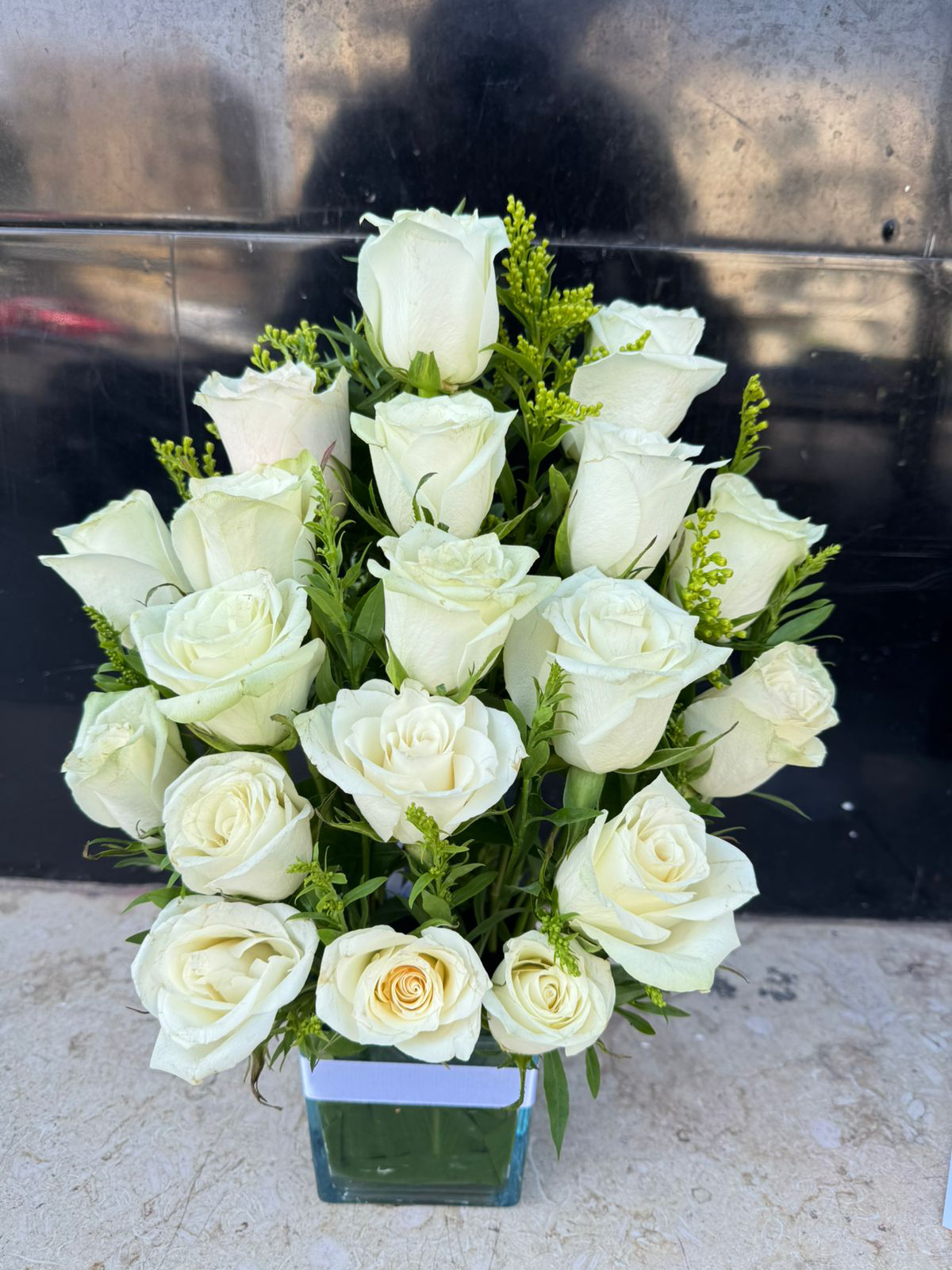 باقة ورود بيضاء فاخرة في مزهرية زجاجية