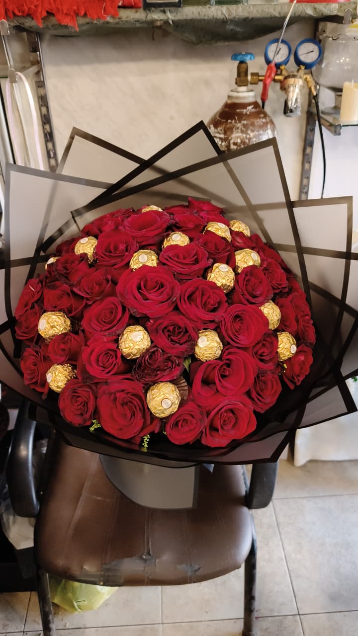 Celebrate timeless love and passion with our Timeless Passion Red Roses Bouquet. Elegantly wrapped in a luxurious White wrap, this bouquet showcases vibrant red roses in quantities tailored to your desire, from 25 to 150 blooms. To make it even more unforgettable, the bouquet is beautifully arranged with Ferrero Rocher chocolates (16 pieces) nestled among the roses—a stunning fusion of romance and indulgence. Perfect for grand romantic gestures, anniversaries, or special celebrations, this customizable bouquet conveys deep emotions with unmatched sophistication. Choose the size that fits your occasion and let this dazzling design leave a lasting impression.